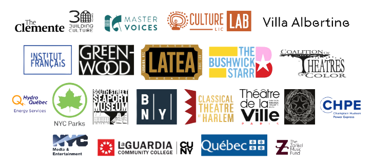 Culture Lab LIC, Long Island City; Green-Wood Cemetery, Brooklyn; New York City Parks: Marcus Garvey Park; Fort Greene Park; Inwood Hill Park; Prospect Park; Tompkins Square Park, Hudson River Park CUNY Stages Theaters: LaGuardia Community College; The Bushwick Starr, Brooklyn; The Clemente Center, a Puerto Rican and Latinx Cultural Space, Lower East Side; New York City Players; South Street Seaport Museum; Seaport Entertainment Group; Agger Fish Building, Brooklyn Navy Yard; MasterVoices Chorus; Downtown Brooklyn Partnership; Milo Rau, The Vienna Festival (Wiener Festwochen); Théâtre de la Ville, Paris, France; McNally Jackson Books; NYC; Mayor's Office of Media and Entertainment